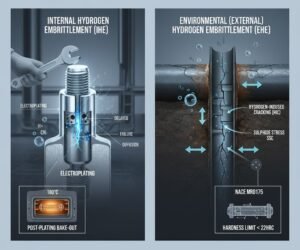 - Electrochemical processes: Operations like acid pickling, electroplating (galvanizing, zinc plating), and even cathodic protection can generate hydrogen on the surface. During acid cleaning or electroplating, hydrogen evolves at the metal surface and may be absorbed, especially if not properly mitigated. High-strength plated fasteners are notorious for failures due to trapped hydrogen (a classic case of internal embrittlement from manufacturing).