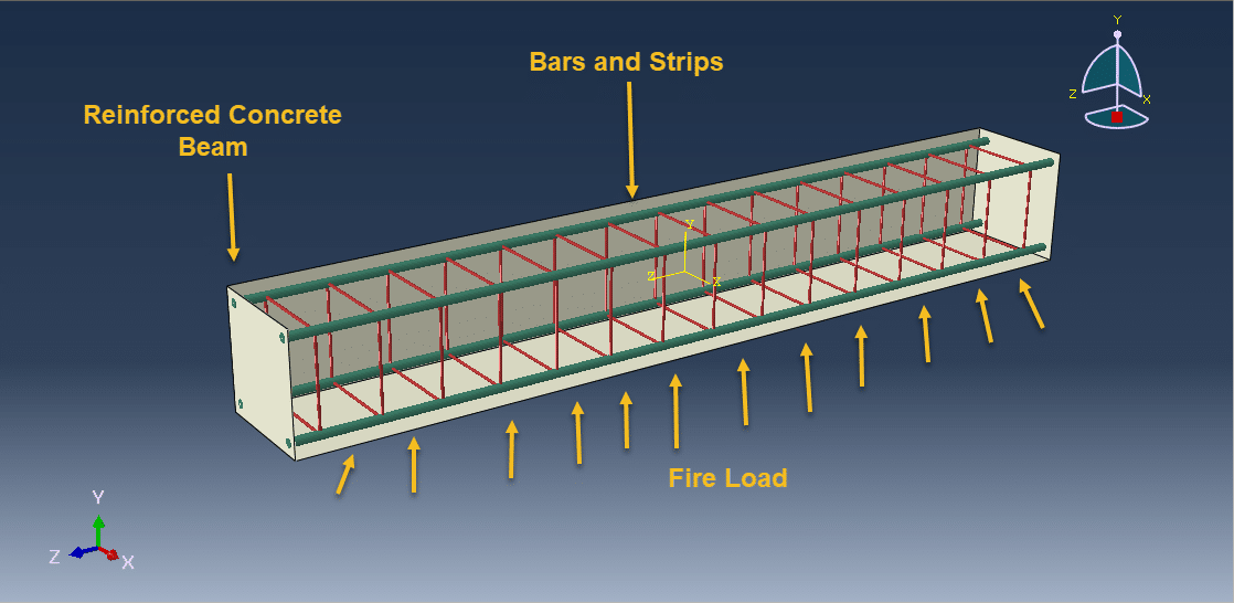 In this tutorial, the simulation of reinforced concrete (RC) beams exposed to fire events has been studied in Abaqus using a fully coupled thermal-stress analysis. The concrete beam is modeled as a three-dimensional solid part, and the steel reinforcements are modeled as wire parts. One of the main concerns in fire engineering is classifying fires as moderate or severe and evaluating their impact on structural performance. This classification helps determine whether a structure can be reused after a fire has been extinguished. Estimating the residual structural capacity of RC beams is complex because it depends on many factors, such as mechanical pre-load during the fire, peak fire temperature, fire duration, degradation of thermal and mechanical properties of concrete and reinforcement, and structural boundary conditions. Not all material properties are reversible during heating, cooling, or post-fire loading, which further complicates the evaluation. Due to the high capital investment in buildings and infrastructure, accurate methods to assess residual capacity through destructive and non-destructive approaches are of increasing importance. This tutorial emphasizes the Direct Coupling Technique (DCT) and the use of coupled elements to simulate RC beams under fire events, addressing a gap in the literature since most numerical studies rely on the Sequential Coupling Technique (SCT) or simplified 2D models. In this study, DCT is implemented in Abaqus to combine thermal and structural analysis in a single model. While SCT involves running a thermal analysis first and then transferring results to a structural model, DCT directly couples thermal and structural degrees of freedom within the same elements. Fire loads are modeled as convection loads applied on beam surfaces exposed to fire, using film coefficients and fire curves that vary with time to simulate realistic heating scenarios. Proper meshing and boundary conditions are assigned to all model components. After completing the simulation, the analysis provides results including temperature distribution, heat flux, stress, strain, displacement, and other structural responses.